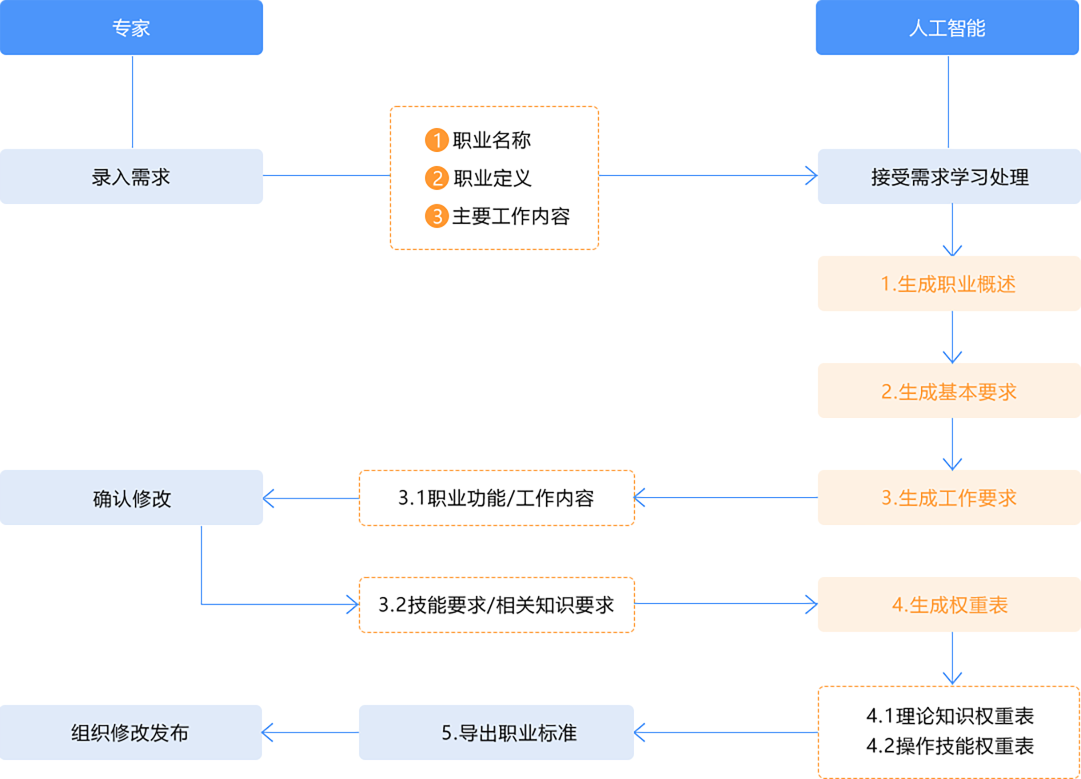 为高效完成职业标准编制工作,充分借助人工智能技术的强大功能,依据《国家职业标准编制技术规程(2023年版)》的要求,人工智能快速整合相关职业的海量信息,精准梳理出关键要素。辅助专家进行科学的职业功能划分、合理的工作内容界定以及准确的技能要求设定,凭借其高效的数据处理能力,可在短短60分钟内,协助专家完成职业标准初稿的编制,大大节省时间与精力,提升编制工作的效率与质量。